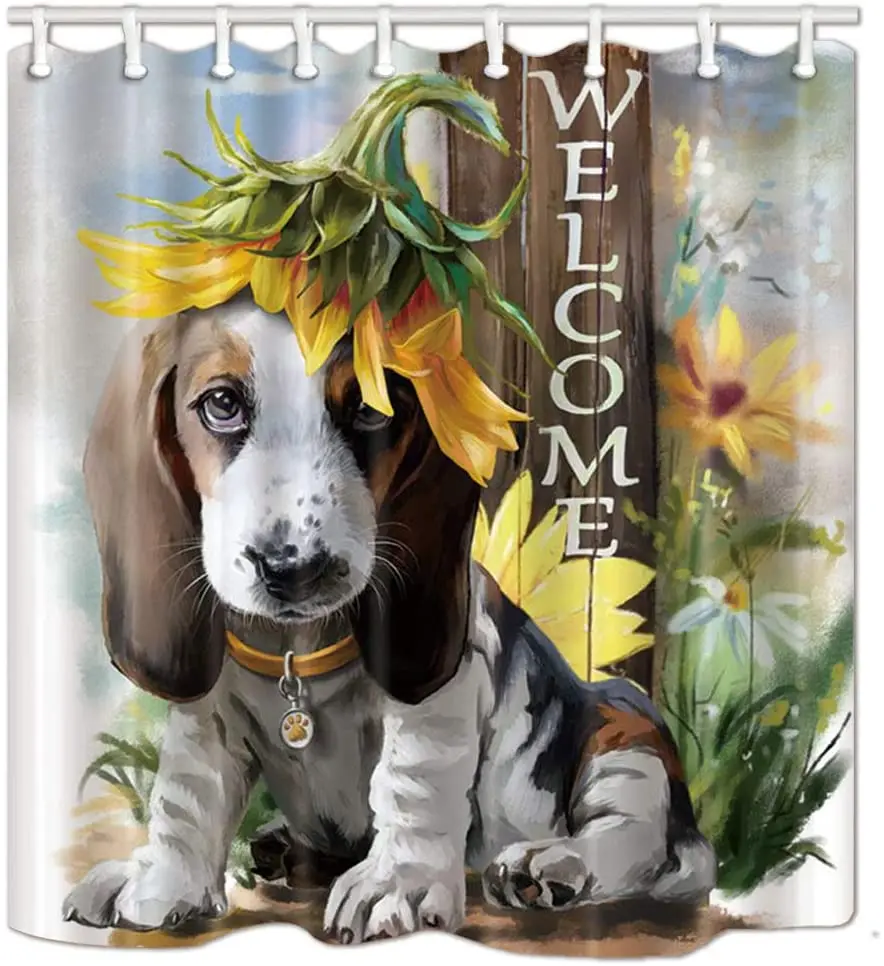 Sunflower Basset Hound Dog Head Welcome Bathroom Shower Curtains